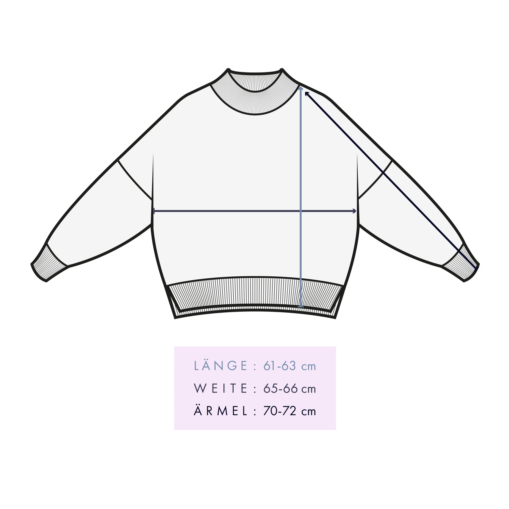 Du kannst einfach einen locker geschnittenen Lieblingspullover, flach & glatt hingelegt, ausmessen und die Maße mit dem 'ONE SIZE' Modell vergleichen. Die Passform und wie locker/eng ein Pullover sitzen soll hängt ganz vom eigenen Geschmack ab. Das ONE SIZE Modell ist ein legerer, moderner Schnitt.